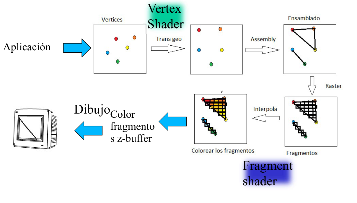 En el retained mode (Opengl 3.3) el paso de coordenadas de escena a coordenadas del clip space se realiza mediante el vertex shader.