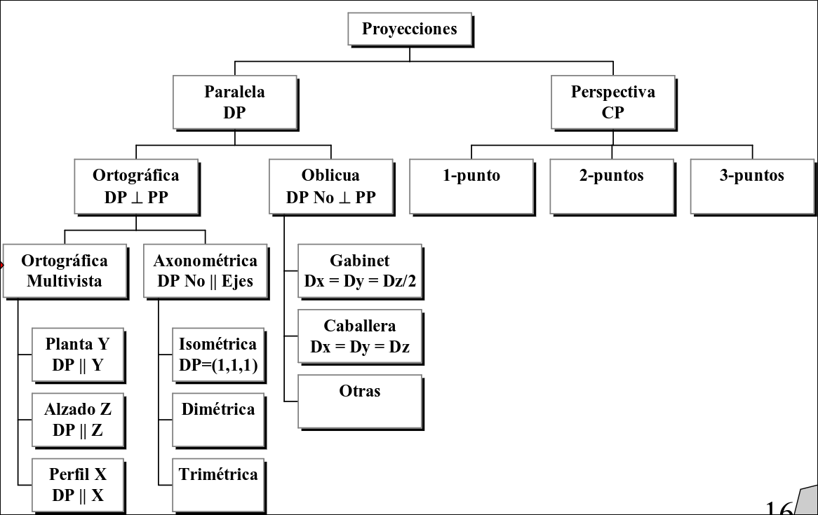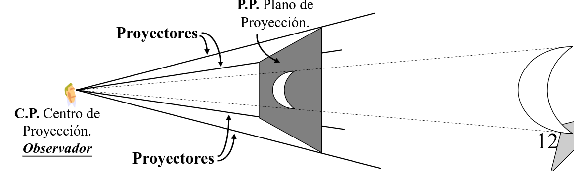 - Proyectores: rayos imaginarios que se trazan desde los puntos del objeto hasta el CP. Los puntos en los que intersecan con el PP determinan dónde de dibujará cada punto del objeto en la imagen final.