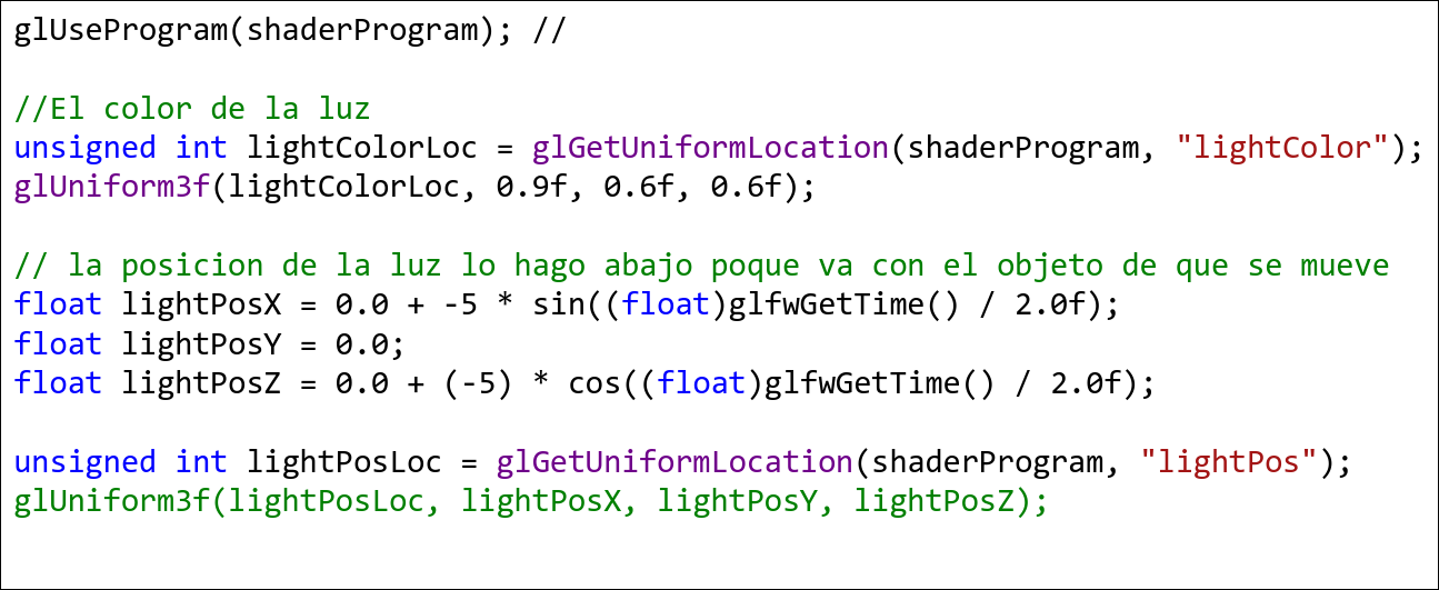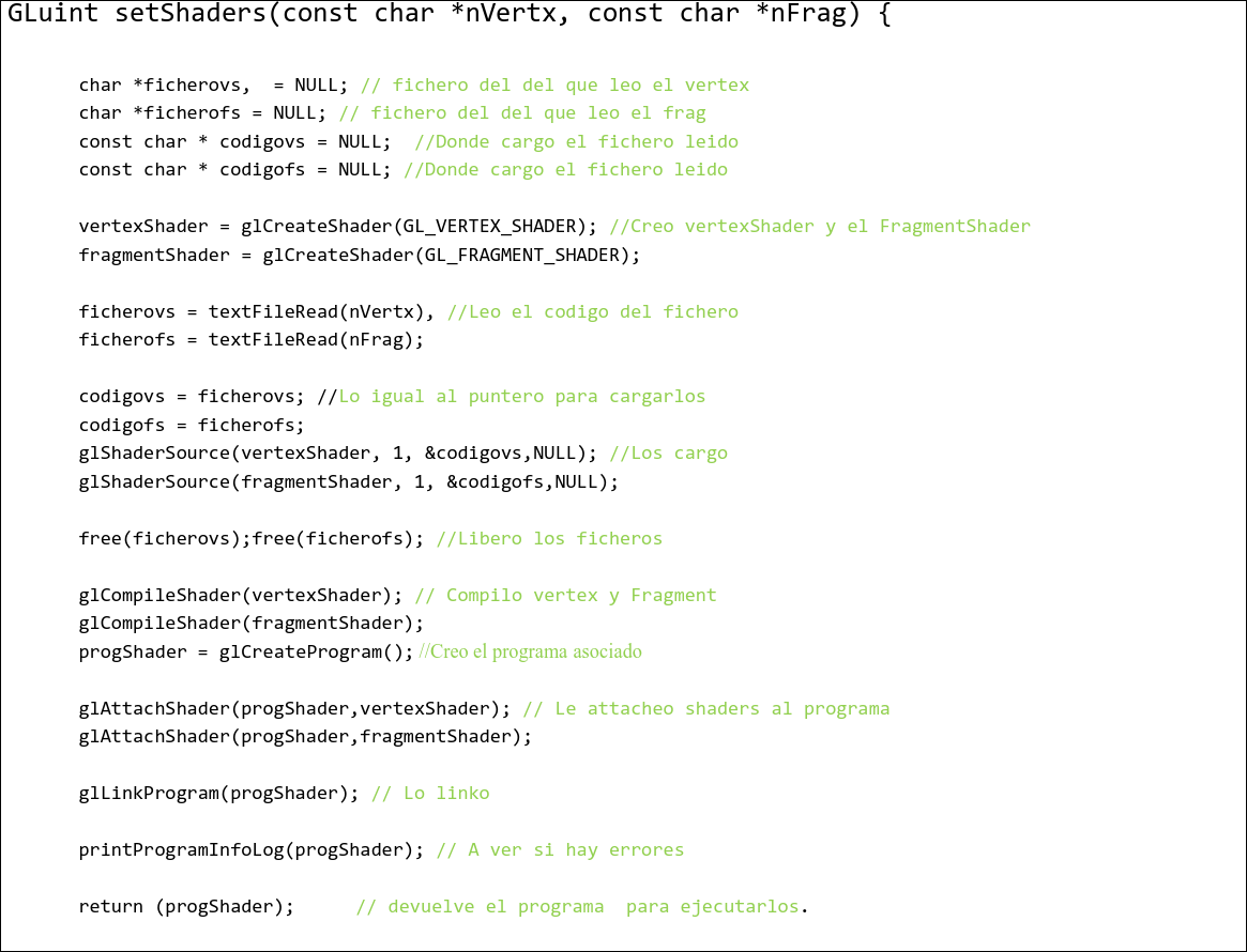 void main() { gl_Position = vec4(aPos, 1.0); ourColor = aColor;}Para utilizar los shaders en el programa: