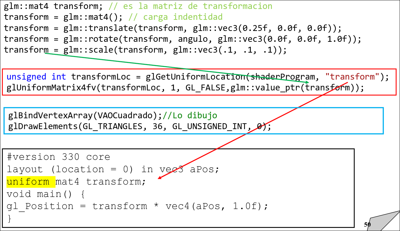 glm::mat4 transform: declaración de la matriz de transformaciónglm::mat4 (): devuelve la identidad 4x4glm::translate(transform,glm::vec3(T_x,T_y,T_z): traslaciónglm::rotate(transform,0, glm::Vec3(x,y,z): rotaciónglm::scale(transofrm, glm::vec4(S_x,S_y,S_z): escalado