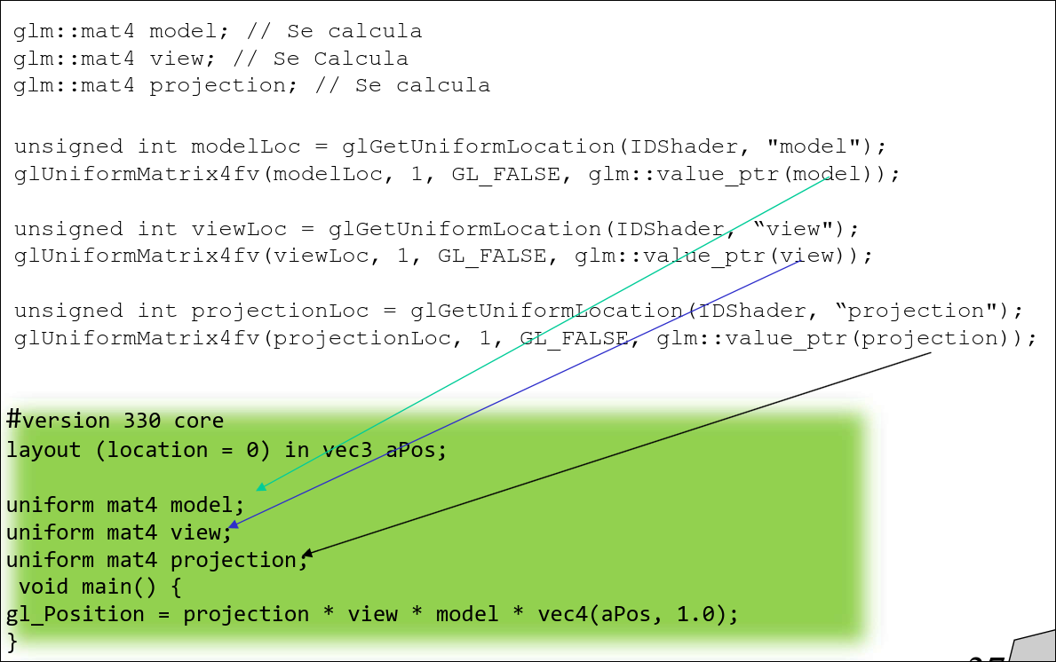 glm::mat4 view = glm::lookAt(glm::vec3(x,y,z), glm::vec3(x,y,z), glm::vec3(x,y,z));: para definir la matriz de vista -