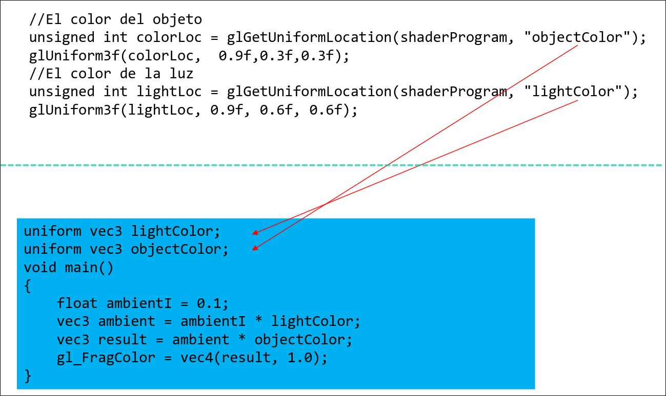 Sección titulada «5.1 Modelo de Iluminación Básico»El color de un objeto es fruto de su color original multiplicado por el color de la luz con la que se ilumina.