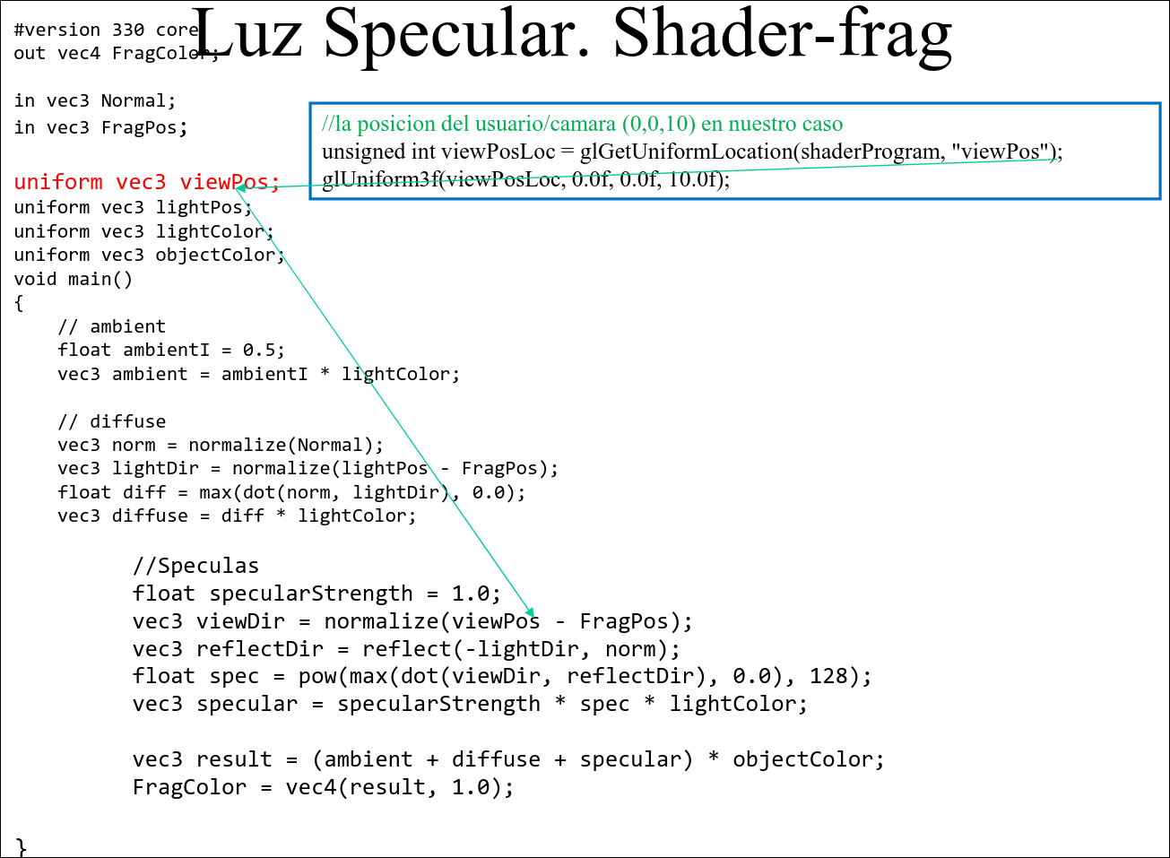 Sección titulada «5.4 Luz Especular»Hay que pasarle al FS, además de lo ya dicho, la posición de la cámara.