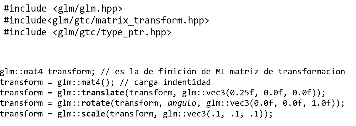 glm::mat4 transform: declaración de la matriz de transformaciónglm::mat4 (): devuelve la identidad 4x4glm::translate(transform,glm::vec3(T_x,T_y,T_z): traslaciónglm::rotate(transform,0, glm::Vec3(x,y,z): rotaciónglm::scale(transofrm, glm::vec4(S_x,S_y,S_z): escalado