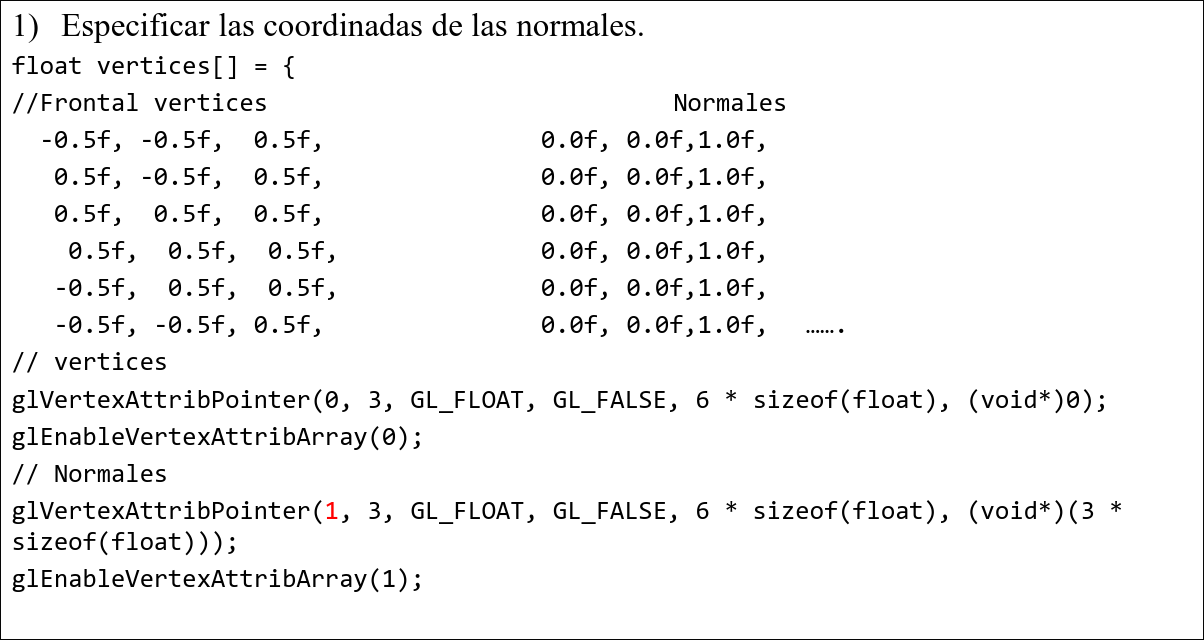 // Se genera el primer atributo ("colores"), identificado con 1, indicando cuántos elementos // del vector compone un color, el salto al siguiente color y dónde empieza el primer color. // Posteriormente, se activa este atributo para su uso. glVertexAttribPointer(1, 3, GL_FLOAT, GL_FALSE, 6 * sizeof(float), (void*)(3 * sizeof(float))); glEnableVertexAttribArray(1);