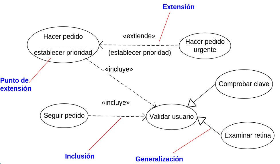 - Relaciones entre casos de uso (generalización, inclusión, extensión) o entre actores (generalización)
