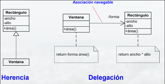 - Delegación: modo de asociación que suple a la herencia por la cual dos objetos tratan una petición, un objeto receptor delega en su ayudante. Facilita combianción de comportamientos en tiempo de ejecución.