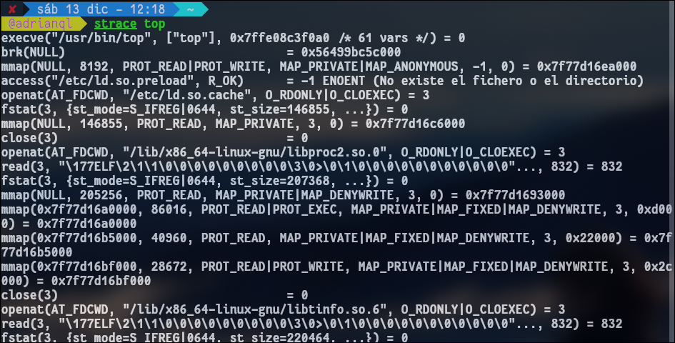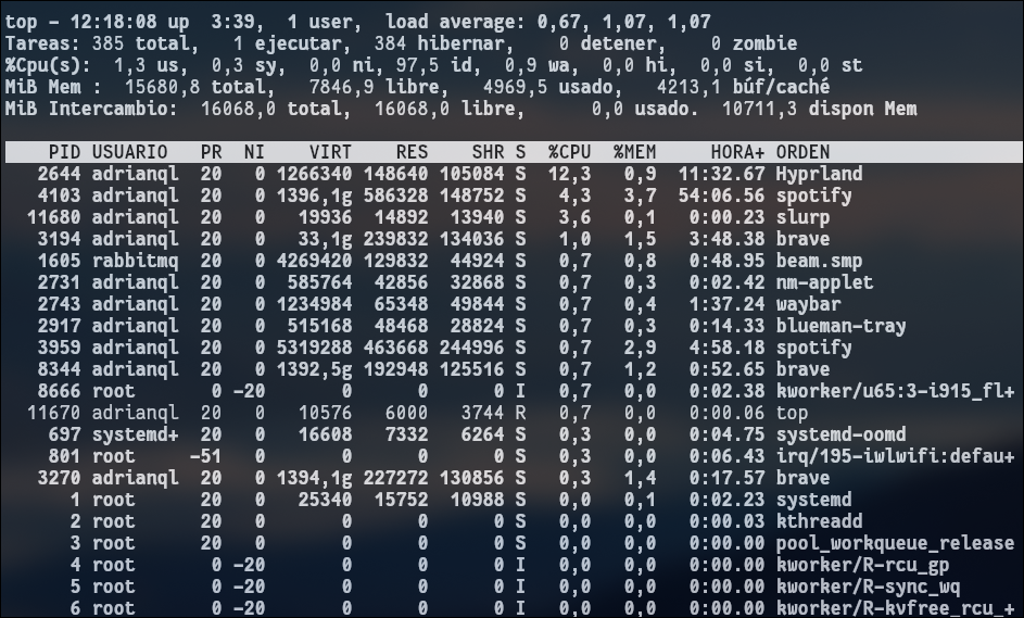 Sección titulada «Herramientas Dinámicas (top)»top es un monitor en tiempo real. En la cabecera podemos ver la hora actual, tiempo que el sistema lleva encendido, el número de usuarios conectados y la carga media del sistema para los últimos 1, 5, y 15 minutos. El número total de tareas y resumen por estado y el estado de ocupación de la CPU y la memoria. En un sistema de n núcleos el máximo de uso de CPU es n × 100 %.