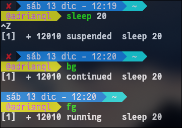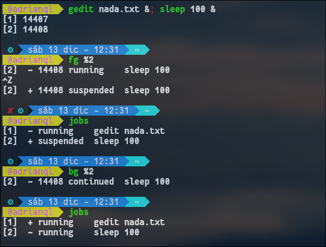 El comando jobs permite ver la lista de comandos en background lanzados desde el shell, así como su estado (fg y bg pueden actuar sobre uno de los jobs identificándolo por su número).