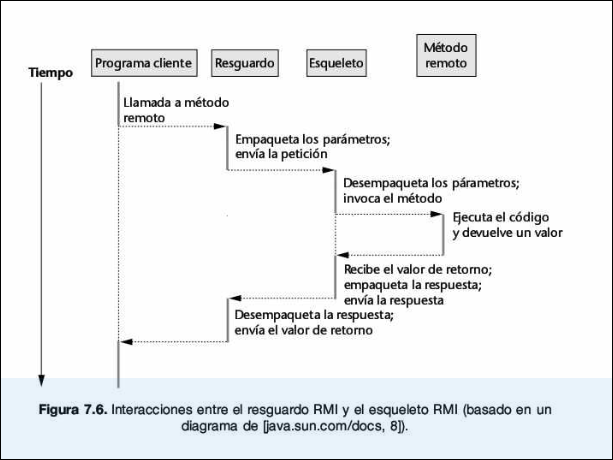 - Retorno: El Objeto Servidor devuelve el resultado al Skeleton, quien lo empaqueta (Marshalling) y lo envía de vuelta al Stub (que hará el Unmarshalling final para el cliente).