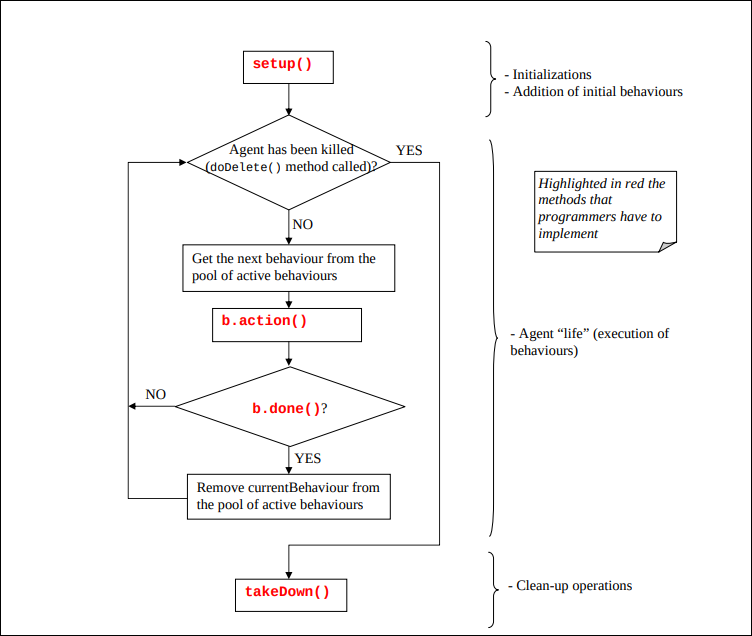 Todo trabajo que hace el agente debe ir dentro de una clase que herede de jade.core.behaviours.Behaviour. Tiene dos métodos clave: