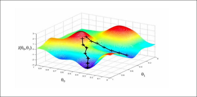En el descenso por gradiente en modelos no lineales, como las redes neuronales, no asegura alcanzar el mínimo global ya que puede quedares en un mínimo local. Por lo tanto la inicialización de los parámetros (los pesos) es importante ya que determina el punto inicial del descenso por gradiente. Tal y como se ve en esta imagen.