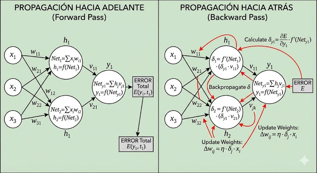 No tenemos un “profesor” para las capas intermedias. La Retropropagación es el método matemático para enviar la “culpa” del error desde el final hacia atrás, capa por capa, para saber cuánto ajustar cada peso interno.