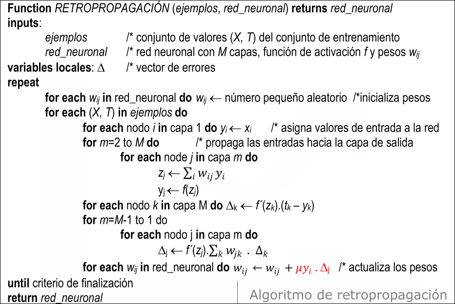 Sección titulada «7.7 Resumen del Algoritmo Completo»- Inicializar pesos: Valores pequeños aleatorios (nunca todos a cero).