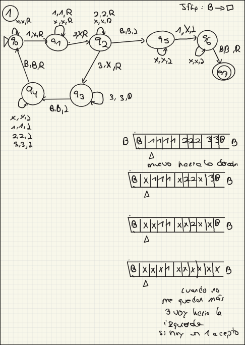 - (Configuración Inicial): La máquina empieza en el estado inicial () con la cabeza lectora al principio de la palabra .
