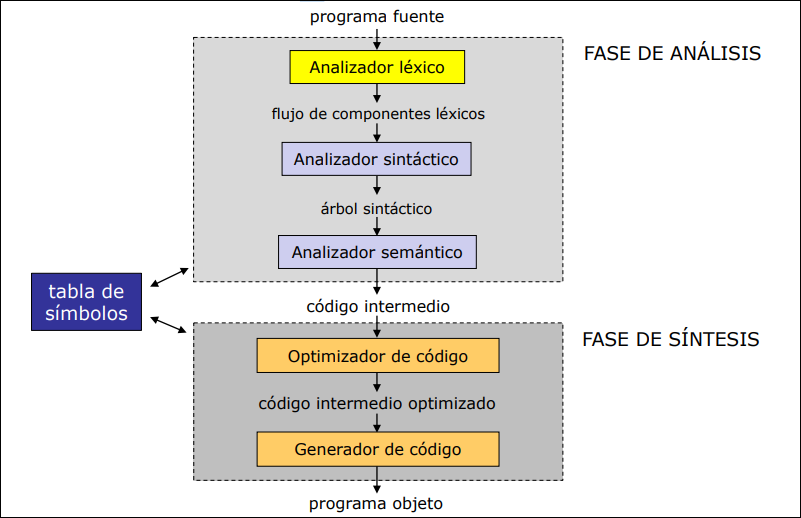 Sección titulada «2.1 Estructura»Los analizadores sintáctico (recibe los tokens y crea una estructura jerárquica que describe la estructura gramatical del código) y léxico funcionan según el patrón productor-consumidor, siguiendo el siguiente esquema: