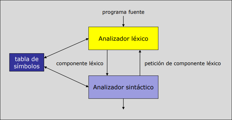 - El analizador léxico, cuando encuentra un identificador, comprueba que está en la tabla de símbolos. Si no lo está, crea una nueva entrada para el mismo.