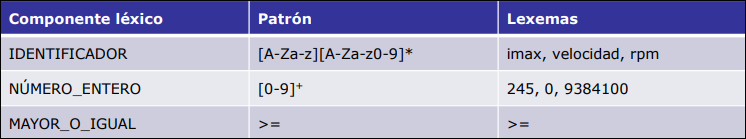 - Patrón: expresión regular que define el conjunto de cadenas correspondientes a un componente léxico.