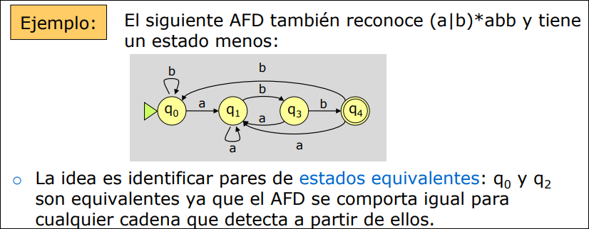 Sección titulada «2.3.3 AFD Mínimo Equivalente»Un analizador léxico será más eficiente cuanto menor sea el número de estados del AFD correspondiente. Para cualquier AFD existe un AFD mínimo equivalente.