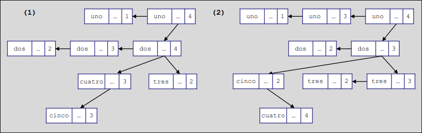 El proceso de construcción comienza con el lexema uno. Al ser un árbol binario de búsqueda basado en el orden alfabético de los lexemas, el siguiente elemento, dos, se inserta a su izquierda (ya que la “d” precede a la “u”). Posteriormente, al insertar tres, el sistema determina que es menor que uno pero mayor que dos, por lo que se posiciona como el hijo derecho del bloque 2.