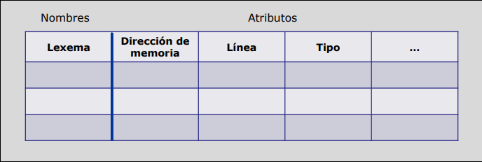 Cuando el compilador encuentra un identificador, guarda en esta tabla la información que lo caracteriza: nombre, categoría (subrutina, variable, constante, clase, tipo,…), la dirección de memoria que se le asigna, su tamaño, etc.