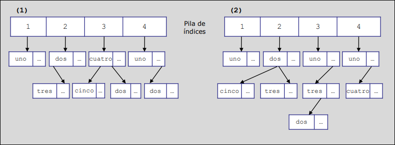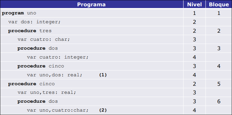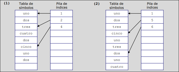 La pila de índices apunta al bloque de esa parte del código. Por ejemplo, en el caso (1), como uno y dos pertenecen al mismo bloque inicial, usan un único índice en la pila. Al entrar en el procedimiento tres y añadir la variable cuatro, se inserta el índice 3 en la pila.