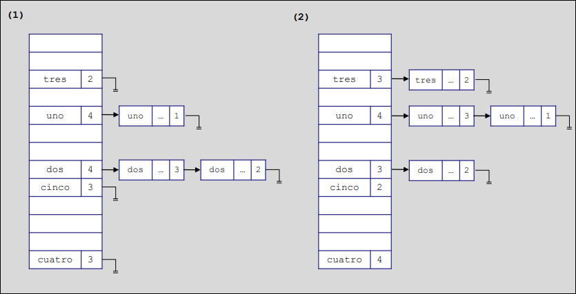 - Tablas hash abiertas. Se utiliza una lista encadenada para resolver las colisiones.