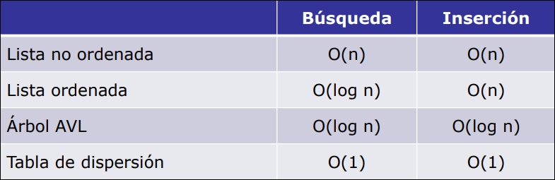 - Tablas ordenadas. Permiten definir el tipo diccionario. Utilizan estructuras de tipo vector o lista ordenada, árboles binarios, árboles equilibrados (AVL), tablas de dispersión (hash), etc.