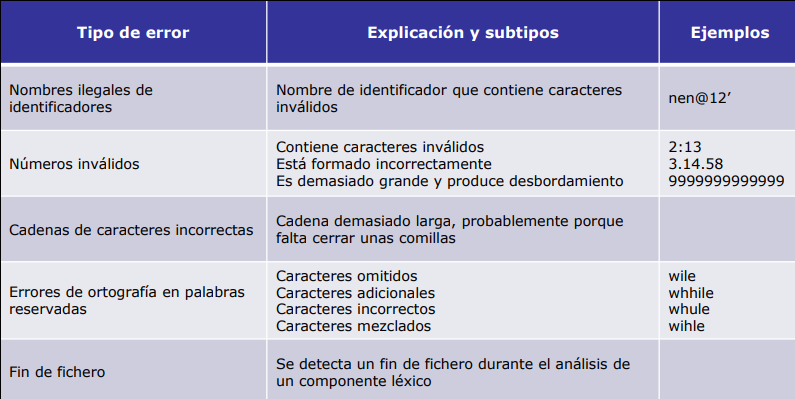 Errores más característicos de la fase de análisis léxico son: